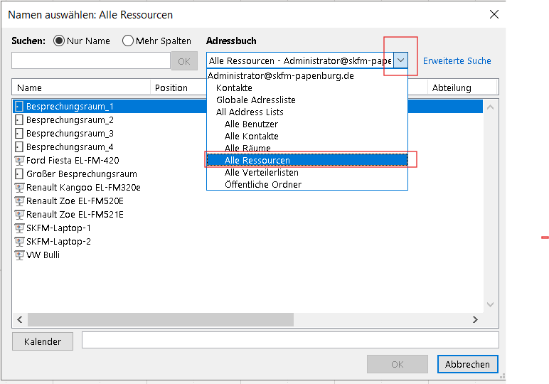 In dem geöffneten Fenster kann nun im Drop-Down Menü die Ressourcen-Liste ausgewählt werden. Es werden alle Ressourcen angezeigt
