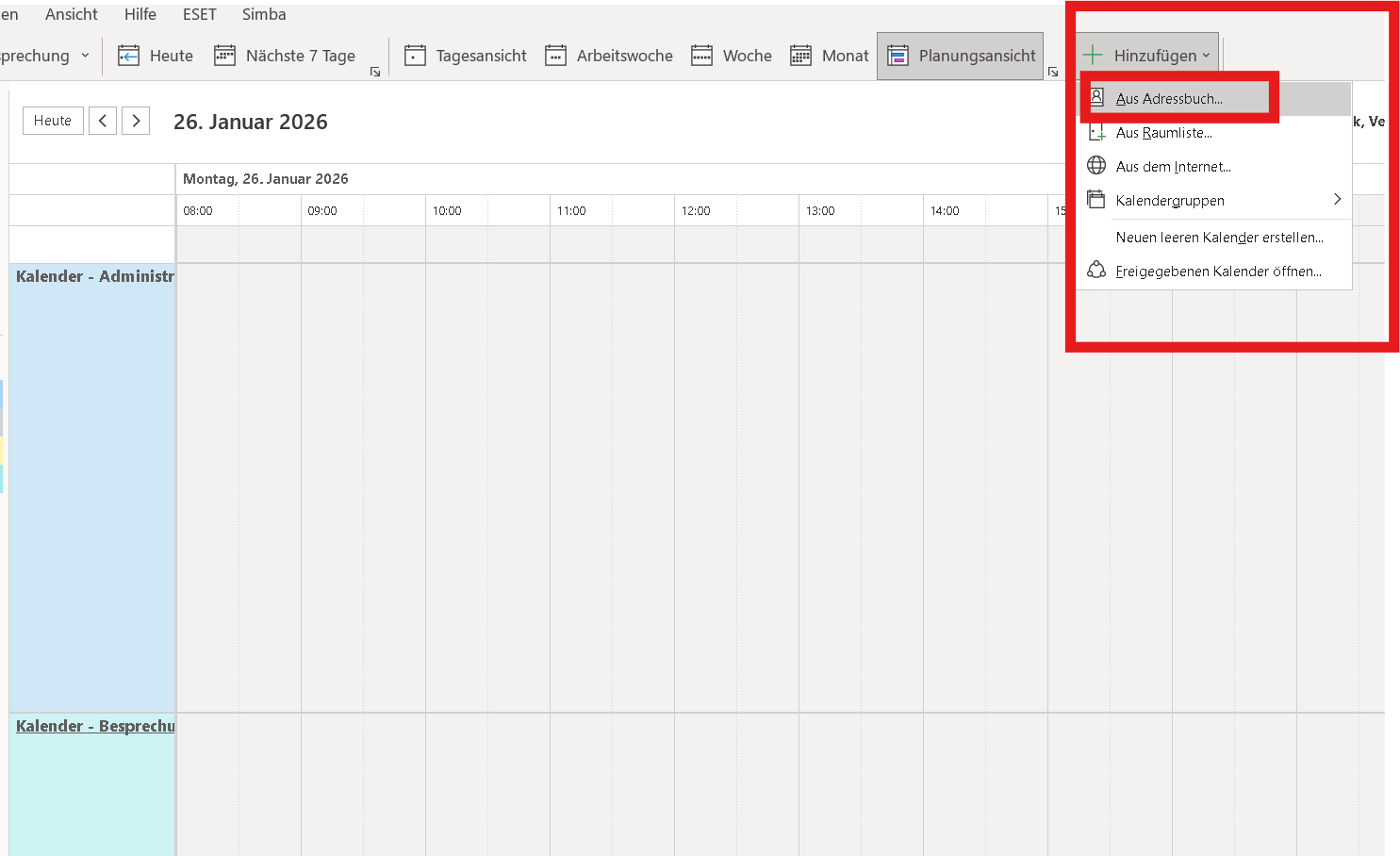 In der Kalenderansicht des Outlooks wird oben in der Menüleiste unter Hinzufügen das Adressbuch ausgewählt: