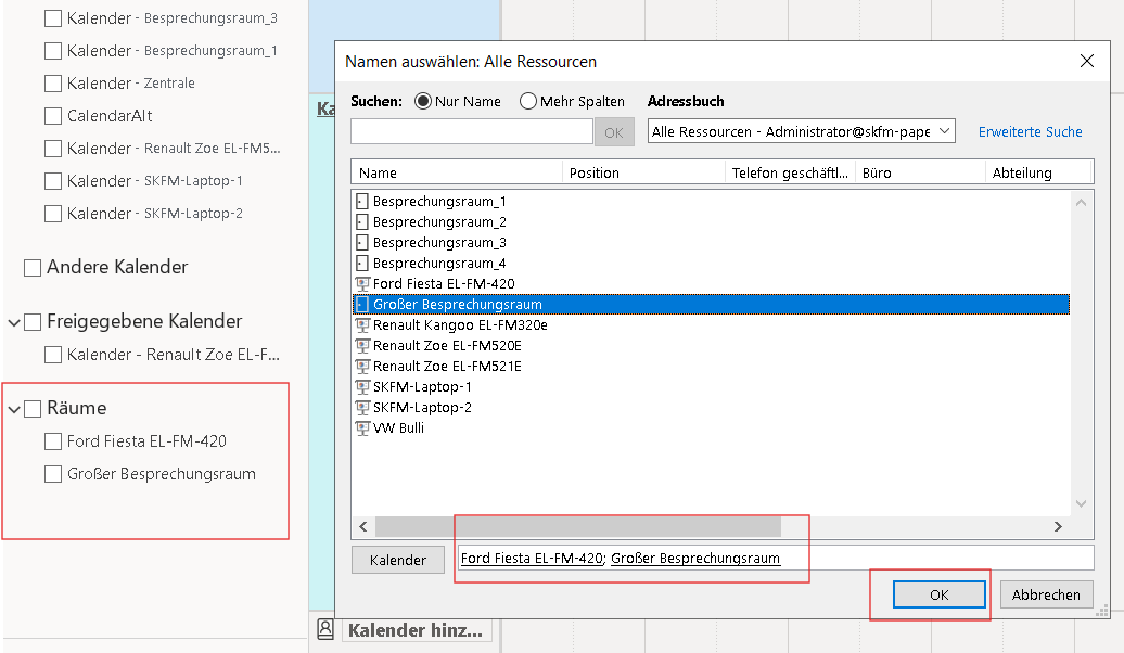 Durch einen Klick auf die gewünschten Kalender werden Sie unten angezeigt und mit einem Klick auf "Ok" zu dem Räumen im in der Kalenderansicht hinzugefügt.